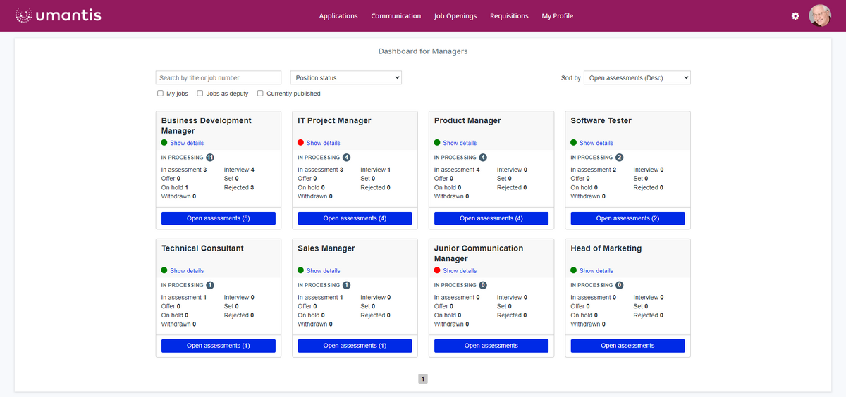 With the help of this dashboard, your managers benefit from the intuitive job overview including approved applications. This allows managers to quickly map a simplified workflow and manage the recruitment phases of applicants.("In view", "Interview" etc.).