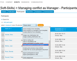 The same applies to the events. Whenever an event becomes part of a development program and this setting is assigned to it, a search link of the participants’ overview appears on the left border, which shows the employees who have not yet registered for this event or one of its sub-events.