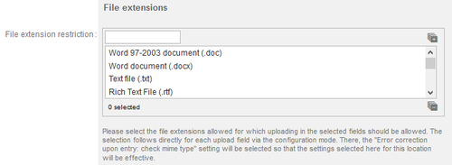 For file uploads, you can specify which file extensions / file formats will be accepted in the upload fields. This means that these fields are “restricted” to uploads of these file formats. A common use case is restricting document uploads to allow PDF files only. This is often used for job applications, for example. To achieve this, the administrator specifies in the global security settings which file formats are allowed when uploading files. Restrictions for individual upload fields can then be set up in configuration mode An error message informs the user if the file to be uploaded is not in one of the permitted formats.